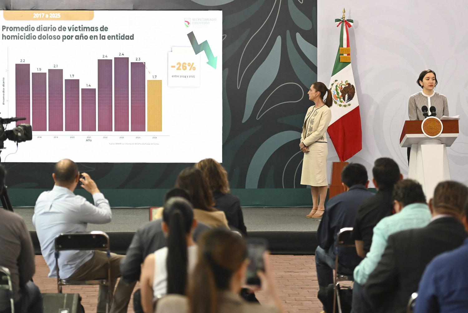 El promedio diario de delitos de alto impacto en Colima disminuyó 27 por ciento, al pasar de 3.33 casos en noviembre de 2024 a 2.43 en febrero de 2026, informó Marcela Figueroa, titular del Secretariado Ejecutivo del Sistema Nacional de Seguridad Pública.