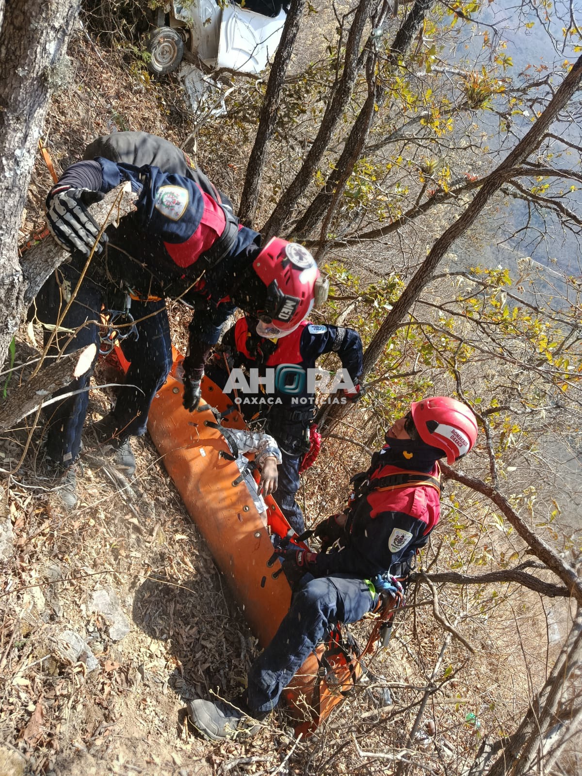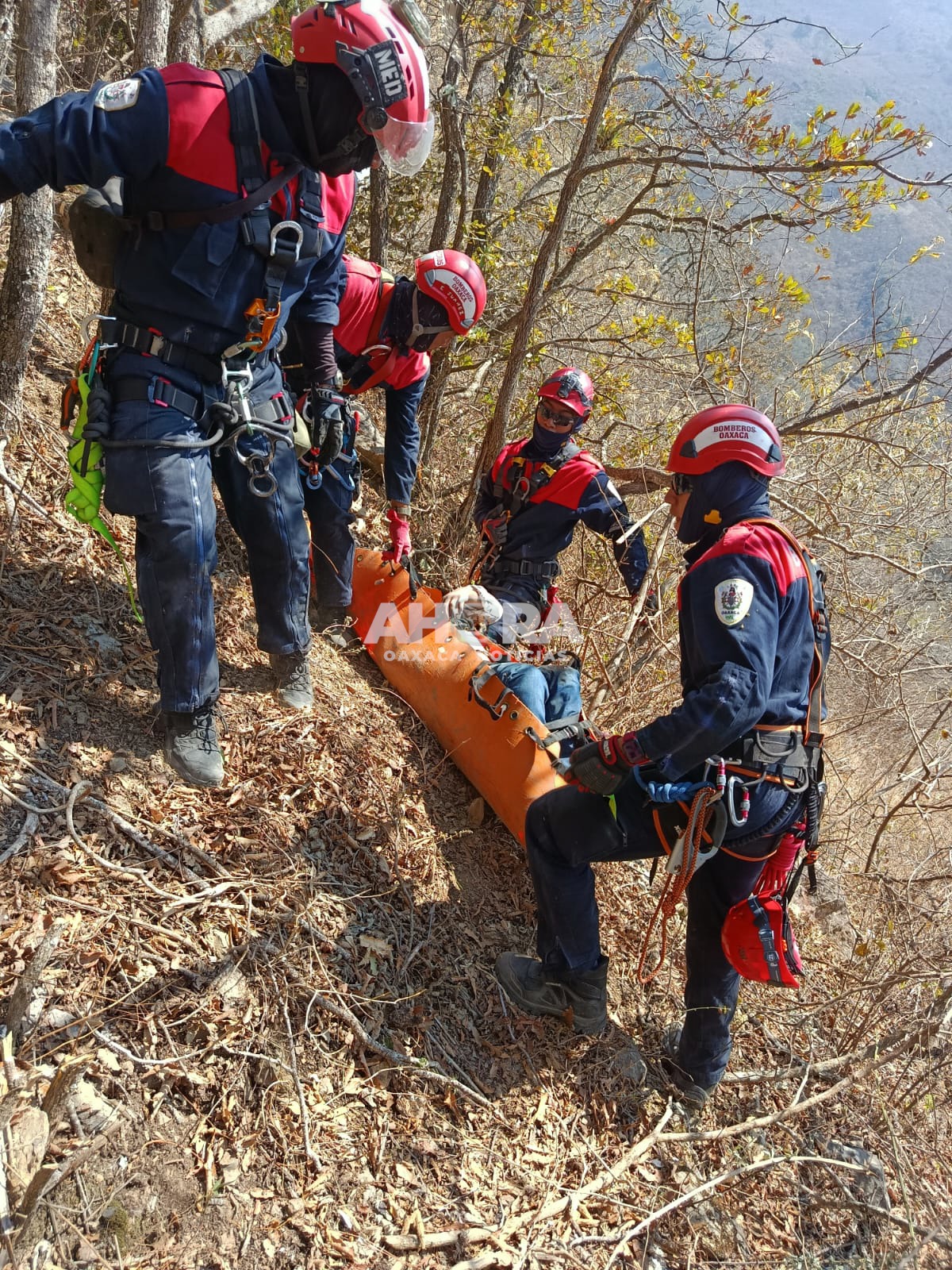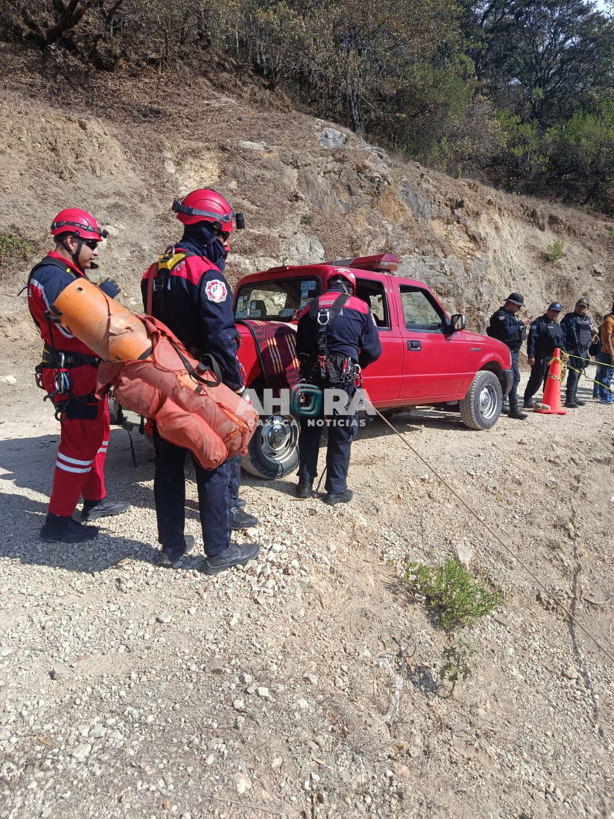 Al arribar al sitio, los bomberos implementaron maniobras de rescate vertical, utilizando equipo especializado para descender de manera segura hasta el fondo de la barranca.